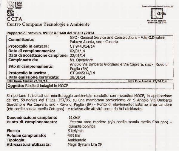 Il Comune, anziché farsene carico come dovrebbe e avrebbe dovuto da un pezzo, se ne infischia e invece assicura ex post di aver fatto fare delle analisi, peraltro a campione ristretto e relative a soli 2 giorni (27 e 28 gennaio 2014 – vedi allegati).