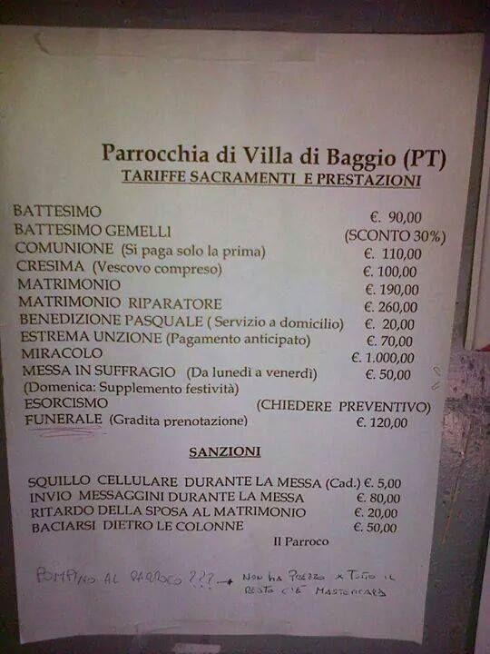 http://www.ansa.it/…/parroco-espone-tariffario…Fedeli scrivono al Papa (ANSA)ANSA.IT - Vincenzo Iurilli hai visto che sono senza il manifestino? e che i fedeli si lamentano dell’impossibilità di cresima? (Quella col “vescovo incluso”)